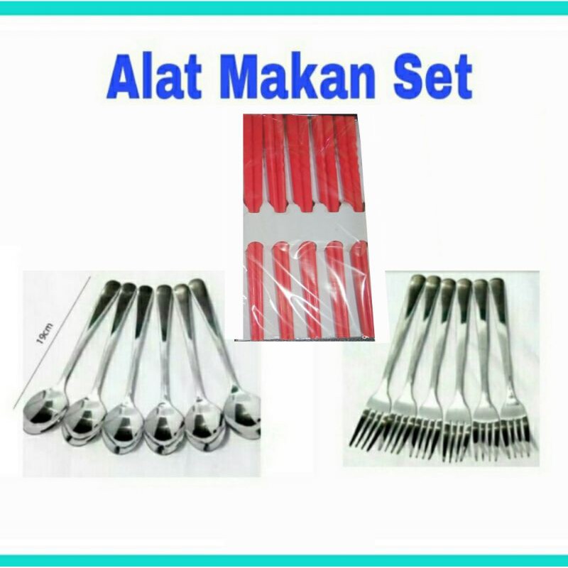 Ready Barangnya Bro,Paket Alat Makan Terdiri dari: 1. 1 Set Sendok 6 Pcs, 2. 1.Set Garpu 6 Pcs, 3. 1 Set Sumpit 5 Pasang, Model Korea dan Jepang, Harga Murah dan kwalitas Eksport Terjamin. Garpu dan Sendok Tebal Stainless Steel kwalitas ekp
