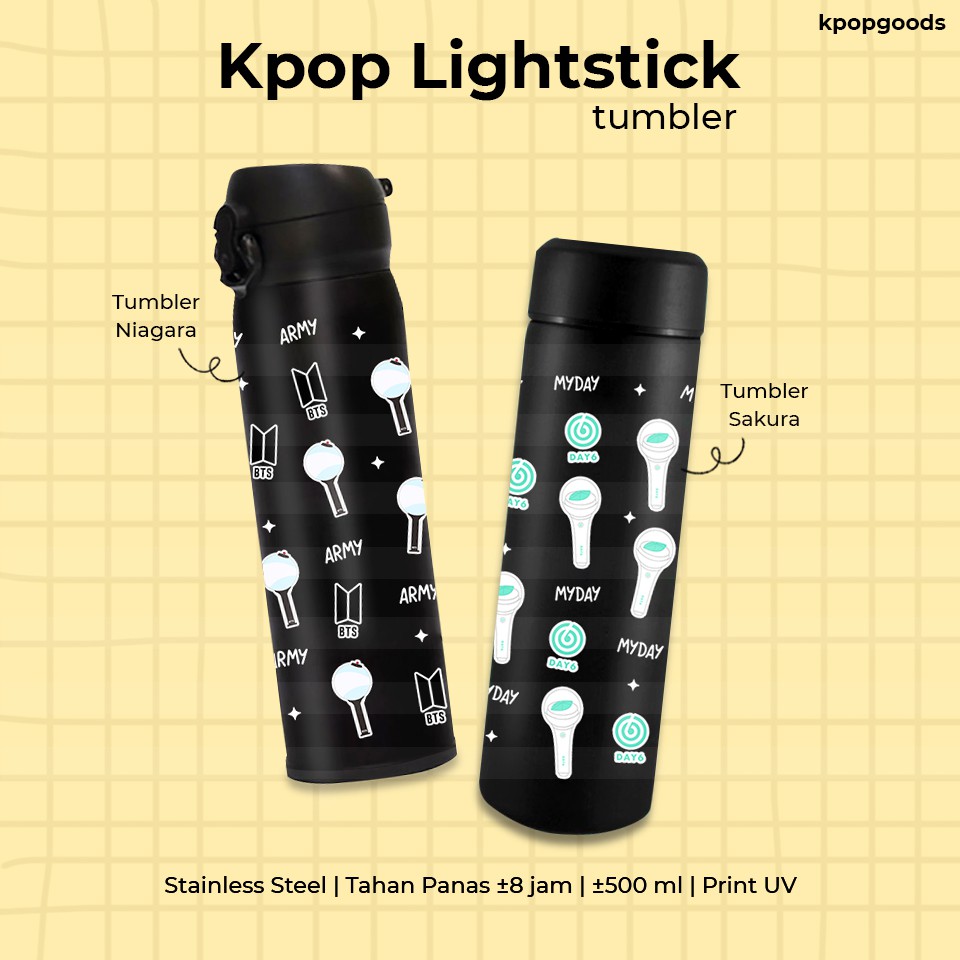 Pre Order 7hari kerja (bisa lebih cepat) ^^ Tumbler Niagara & Sakura- Kapasitas : ±500ml- Stainless steel, tahan panas ±8jam- Gambar di-print dengan tinta UV (bukan sticker)- Variasi Boygroup: BTS DAY6 EXO GOT7 NCT STRAY KIDS SEVENTEEN*bisa request lightstick girl group/boy group lain, silakan langsung chat adm
