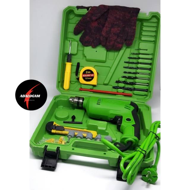 Mesin Bor yang sangat ekonomis dari Tekiro Ryu, ditunjang dengan fitur dan tenaganya yang mempuni. Dilengkapi dengan Switch Lock, Double Insulation dan Rubberised Grip membuat mesin ini menjadi lebih nyaman serta kompak dipakai baik bagi pekerjaan maupun hobby anda.Voltase: 220V/50HzDaya Listrik: 370 WattKec. Tanpa Beban: 0 - 3200 rpmKapasitas Bor Besi: 10 mmKapasitas Bor Kayu: 10 mmFitur: Reversible, Variable SpeedKelengkapan: Mata Bor SDS 1.5, 3, 4, 5, 6, 8mm, Spur Bits 5, 6, 8mm, Rol Meter 2M, Obeng Bolak-Balik, Cutter, Pensil Tukang, Sarung Tangan, Batu Tuner 5 Pcs, Screw Fisher 6 Pcs, Box PlastikGaransi: 6