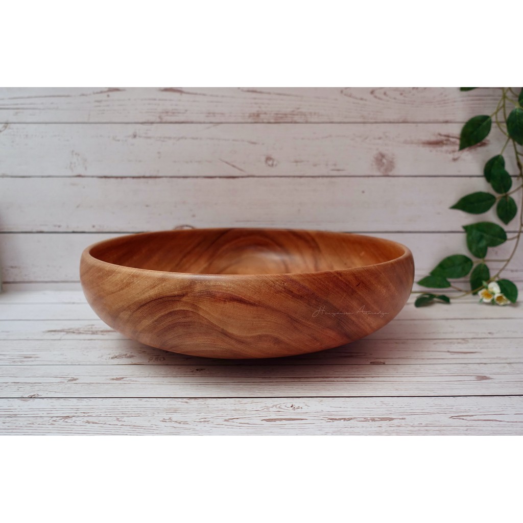 Diameter: 35 cmTinggi/Height: 11 cmBerat/Weight: 1280 gr*Murni buatan tangan, dimohon pengertiannya bila ada perbedaan ukuran karena proses manual (this is a handmade product, please allow slight variance in the measuremens) Mangkuk ini diberi nama Mangkuk Donut karena bentuknya yang melingkar berongga di dalamnya seperti donut. Cocok untuk menyimpan atau menyajikan buah buahan atau gunakan sesuai kebutuhan yang di rasa cocok. Corak kayunya sangat cantik karena kayu asem yang dipakai berasal dari kayu asem tua dengan alur serat yang sangat berkharakter. Namun demikian, tiap motif produk ini akan berbeda beda karena tiap bagian kayu memiliki corak serat dan warna alami yang unik. Untuk membersihkan, cukup gunakan air biasa dengan sabun lembut dan segera keringkan. Jangan dicuci di dishwasher. Tidak untuk di masukan ke dalam microwave dan lemari es. Hindari paparan sinar matahari langsung atau tempat yang terlalu panas. Jangan disimpan atau diletakan di tempat lembab. ~~~Beautifully hand-crafted in the shape of a doughnut, this bowl is made of an aged Tamarind wood with gorgeous spalting that adds strong character to this bowl. Do note, each product will be uniquely one of a kind item for we keep the wood grains and colour as they are.To clean, please just use water and mild soap and dry immediately. Do not wash in the dishwasher and not to be put inside a microwave and refrigerator.Avoid prolonged exposure to direct sunlight or excessive heat. Store in dry place and away from moist