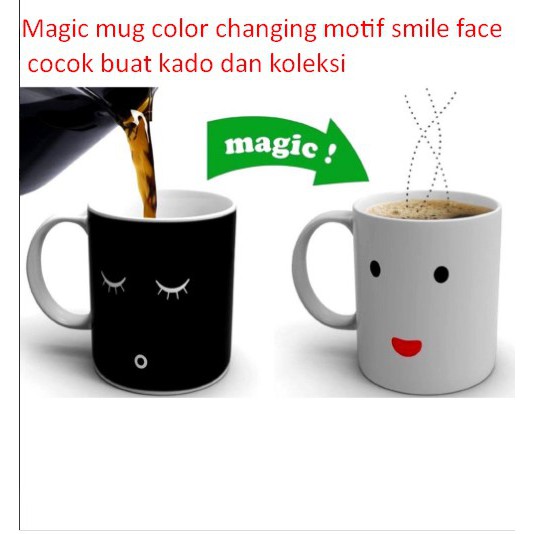 Magic mug color changing motif smile face cocok buat kado dan koleksiCangkir ini spt magic saat anda memasuki air panas akan berubah mimik nya dan jika dikasih air dingin akan meredup