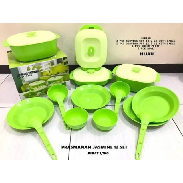 Jasmine serving of 12 pcs2 pcs serving se ( 3,2 L ) with ladle2 pcs serving set ( 1,8 L ) with ladle4 Pcs round plate4 pcs BowlNOTE :- KERUSAKAN BARANG SAAT EKSPEDISI / PENGIRIMAN BUKAN TANGGUNG JAWAB PENJUAL.Selalu baca deskripsi sebelum belanja ya kak..Happy shoppingPERHATIAN!Semua Stok Produk Kami Ready, silahkan langsung saja di orderKualitas produk terjamin.Dapatkan produk asli hanya di toko ini.Hati hati dengan barang tiruan diluar toko ini yang kualitas produk belum terjamin.-deffandra