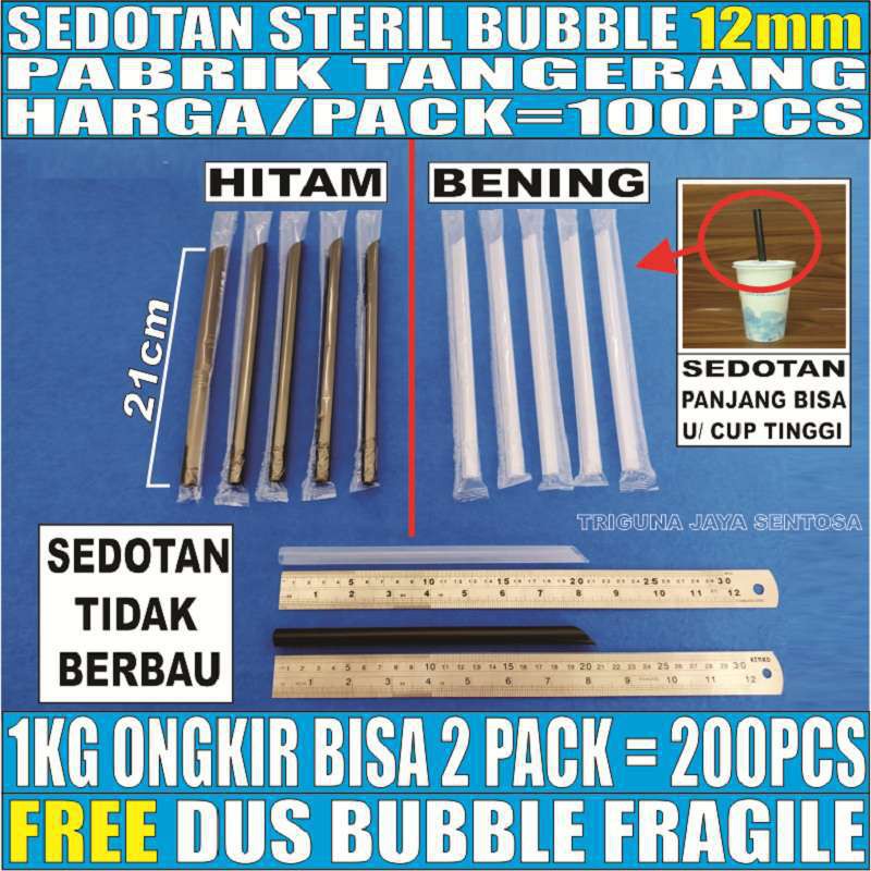 FREE packing dus bubble fragileSedotan Bubble Steril 12mm Boba Hitam Atau Bening Panjang 21cm Higienis Buble 1221Harga Rp.12.700 untuk 1 pack isi 100pcs sedotanHarga per pcs = Rp.12.700 /100pcs = Rp.127/pcsDisini link pack (tulisan putih) bisa semua jasa kirim1 Ball = 25 pack x 100 pcs = 2500 pcsHarga 1 Ball = 25 pack x Rp.11.000 = Rp.275.000Pembelian dus khusus grab sameday Tangerang Jakarta link di bawahhttps://shopee.co.id/product/109689275/6360293160/Pembelian dus bisa semua jasa kirim ekspedisi berat normal link di bawahhttps://shopee.co.id/product/109689275/5260294085/Lokasi kami[1.Disini Lokasi tangerang (Dasar BIRU) bisa semua jasa kirim TOKO triguna jaya sentosa[2.Lokasi Jakarta (Dasar HIJAU) khusus gojek sameday bisa 7dus TOKOtriguna jaya jakarta[3.Lokasi Bekasi (Dasar UNGU} khusus gojek sameday bisa 7dus TOKOtriguna jaya bekasi[4.Lokasi Medan (Dasar Grey} bisa semua jasa kirim TOKOtriguna jaya medan[5.Lokasi Bandung (Dasar Merah} bisa semua jasa kirim TOKOtriguna jaya bandung[6.Lokasi Surabaya (Dasar Coklat} bisa semua jasa kirim TOKOtriguna jaya surabayaSpesifikasi :Material PPSedotan bubble steril bungkus plastik satu satuDiameter terluar 12mmDiameter lubang dalam 11.4mmPanjang 21 cmTidak berbauBisa untuk cup tinggiWarna hitam Tebal 0.3mmWarna bening Tebal 0.3mmUjung tajam untuk tusukBerat ekspedisiTimbangan body per pcs 1.75 grBerat per pcs 1.75 grBerat per pack 175 grUk pack 22 x 17 x 9 cm / 6000 = 561 gr volume1 pack isi = 100 pcs = 561 gr ongkir pack ikut volume1 kg ongkir ekspedisi bisa 2 pack = 200 pcs1 Dus = 25 pack x 100 pcs = 2500 pcsUk Dus = 75 x 45 x 23 cmBerat per dus timbangan = 5 kg => 5 kgOngkir dus ekspedisi udara = 75 x 45 x 23 cm / 6000 = 13 kg => 13 kg ikut volumeOngkir dus cargo darat / laut = 75 x 45 x 23 cm / 4000 = 20 kg => 20 kg ikut volumeGrosir Pack2 - 4 Rp. 12.6005 - 9 Rp 12.50010 - 19 Rp 12.30020 - 24 Rp 12.00025 - 50 Rp. 11.000Triguna Jaya Se