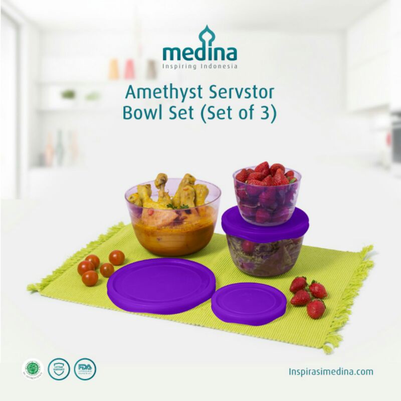 Amethyst Servstor Bowl Set ( Set of 3 ), terdiri dari:- 1 pc mangkuk kapasitas 1600 ML + Tutup- 1 pc mangkuk kapasitas 970 ML + Tutup- 1 pc mangkuk kapasitas 510 ML + TutupKeunggulan:- Material produk dari PC, tidak mudah Pecah- Penutup yang rapat menyimpan makanan lebih awet dan lebih mudah- Badan mangkuk yang transparan, memudahkan melihat makanan di dalamnya- Microwave safe dan Freezer safe- Food Grade, aman untuk makananBerat real : 470 grBerat volume: 610